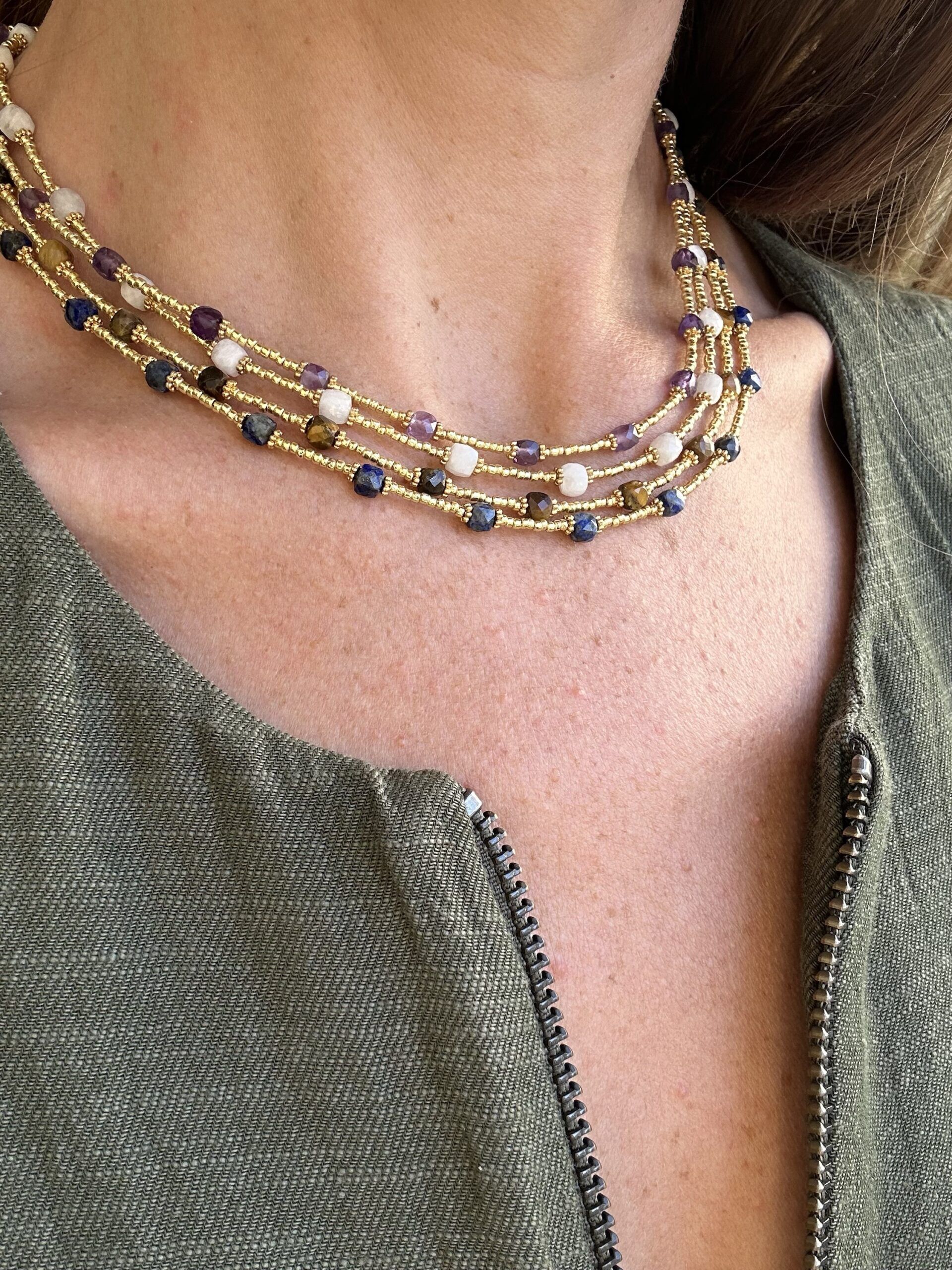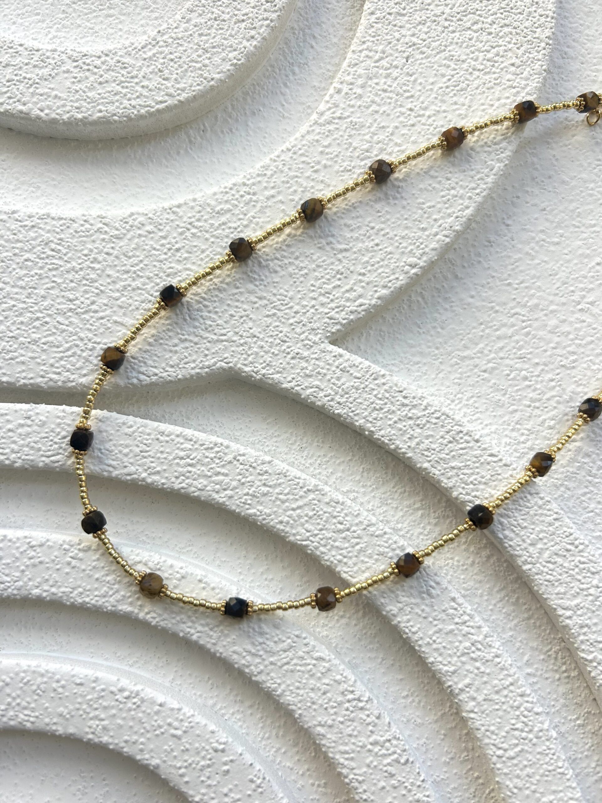 Collier Aliyah avec ces pierres naturelles, peut se mari avec toutes vos tenues. Aliyah signifie “élévation” ce collier viendra vous élever spirituellement, moralement et physiquement. Caractéristiques matériaux : – Fermoir et rallonge en acier inoxydable – Perles miyuki en verre doré Déclinaison en différentes pierres naturelles : Catégorie Amour : Améthyste Catégorie protection : Onyx – Oeil de tigre Catégorie Abondance : Cristal de roche Longueur chaine : 40cm +5 cm de rallonge Bijoux purifiés, rechargés et magnétisés avant l’envoi. Conseils d’entretien : Pour garder la dorure intacte, il est recommandé de ne pas l’utiliser en accumulation avec plusieurs bracelets à cause des frottements. Pas de contact avec l’eau, l’eau de mer, clore, le parfum et cosmétiques.