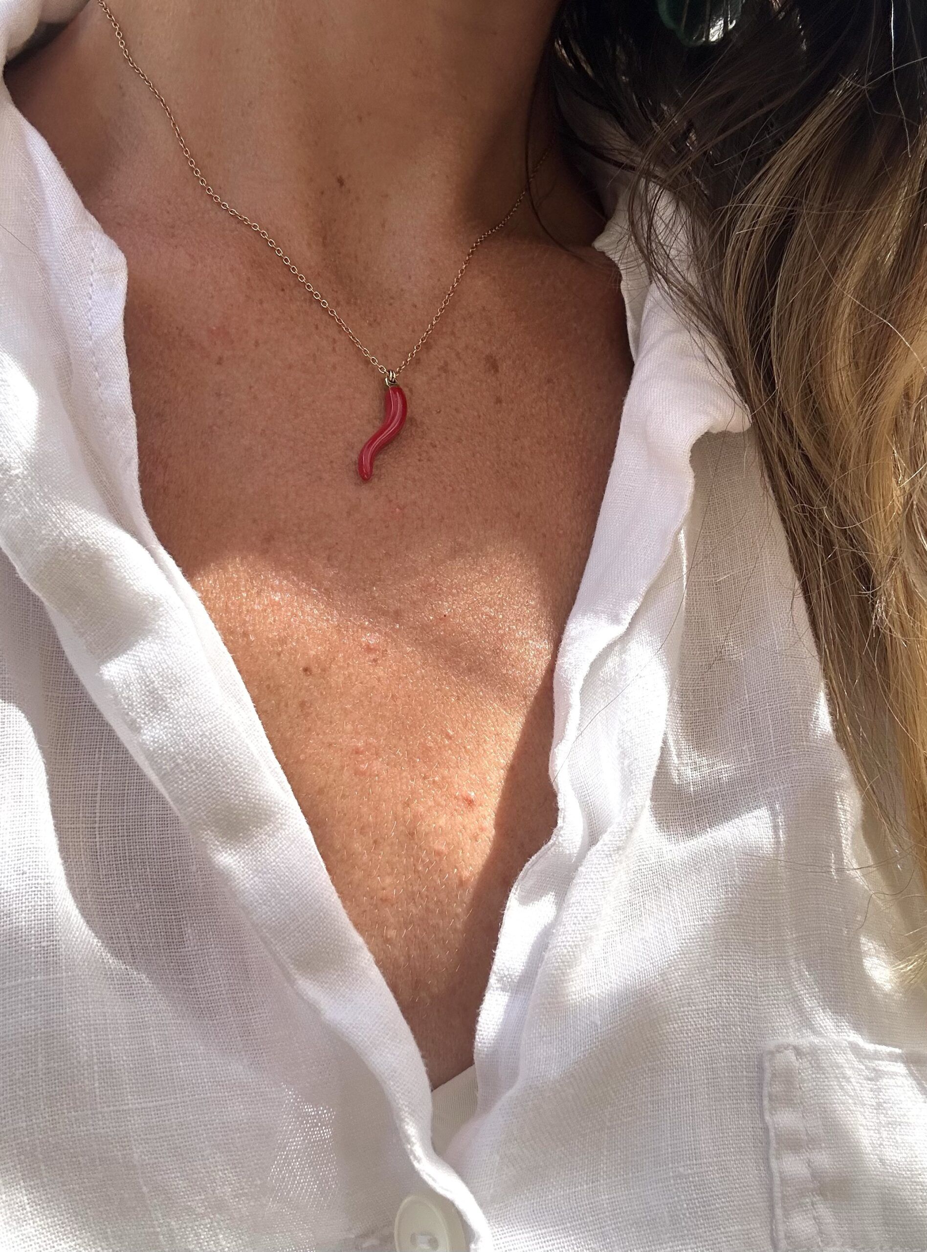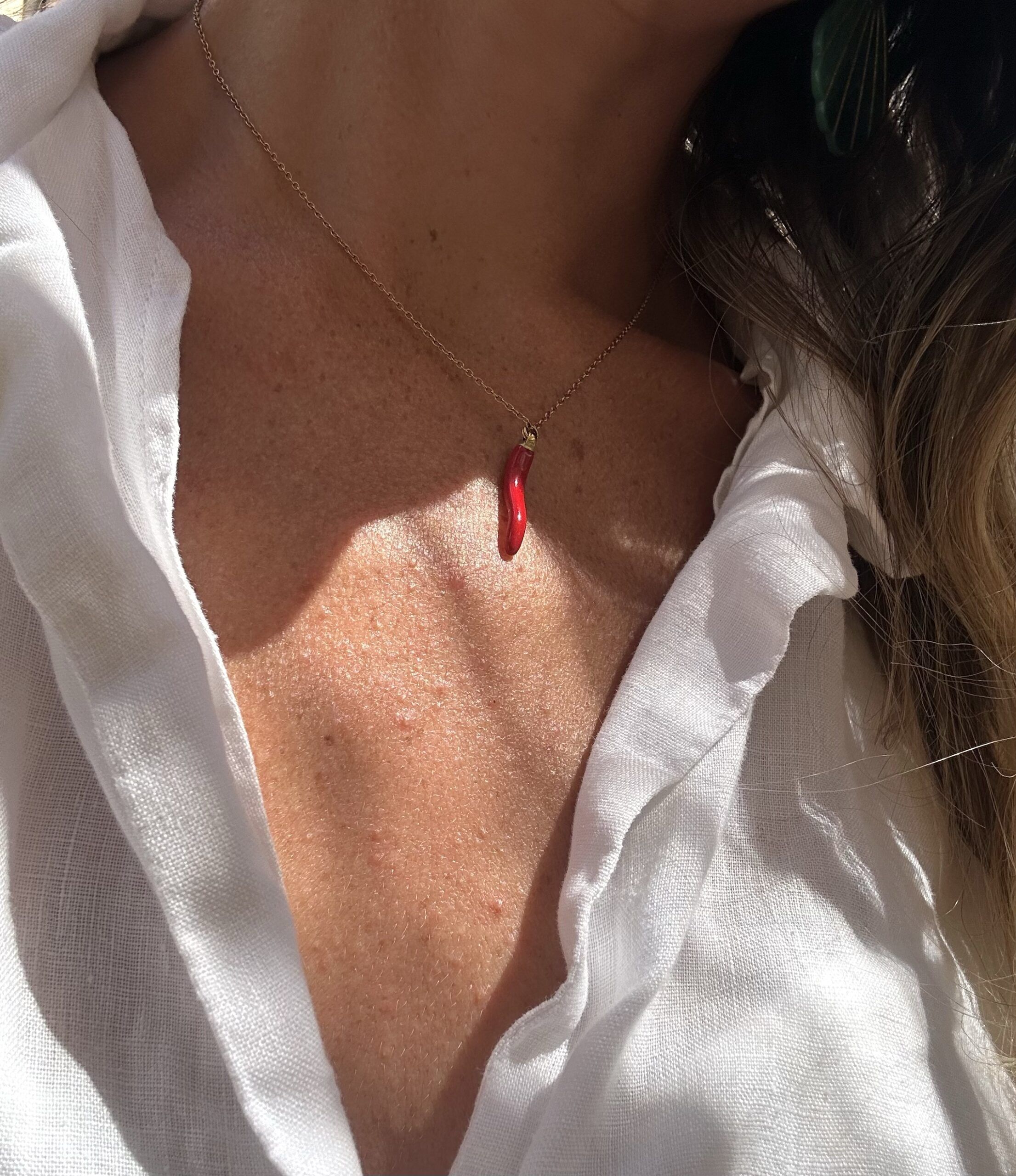 Collier pendentif piment appelé “Corne italienne” ou “Corne d’abondance“, un porte bonheur.