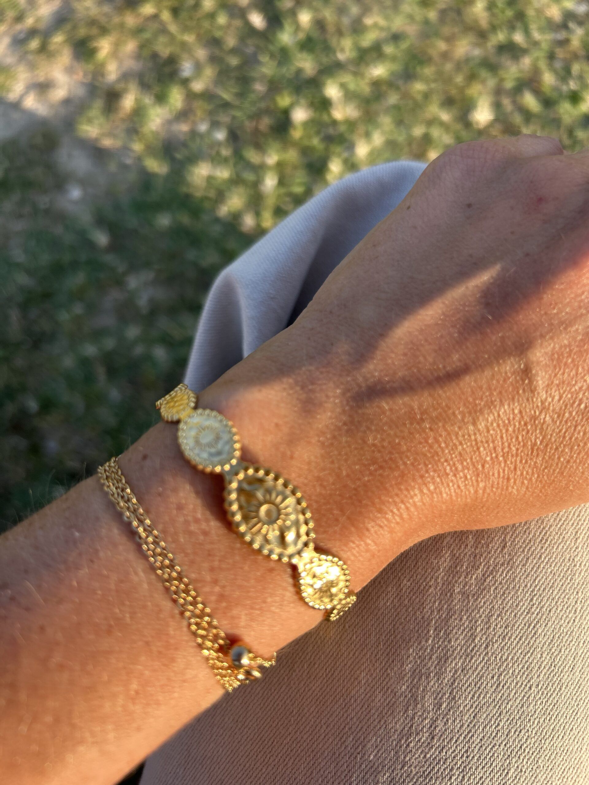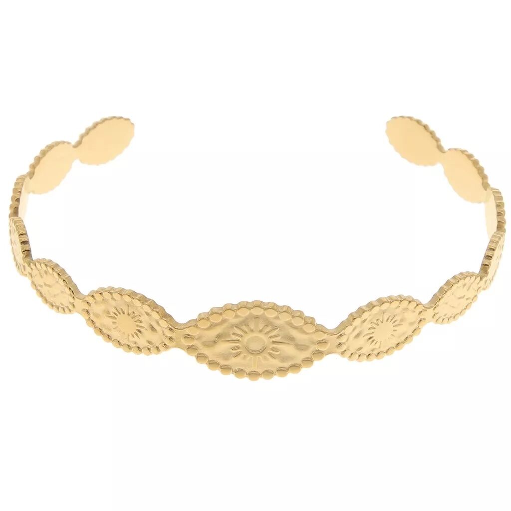 Jonc Esmee, élégant et intemporel, martelé avec le symbole du soleil. Vous pouvez l’accumuler avec n’importe quel bracelet, cela lui donnera une touche de modernité et originalité.